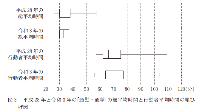 である。(iii) 次に、太郎さんと花子さんは、平成28年と令和3年の「通勤・通学」に費やした時間を比較することにした。