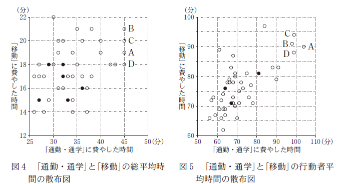 問題文にある通り、図4 では、「通勤・通学」の総平均時間が同じ値になっていますが、図5 では、「通勤・通学」の行動平均時間について、点 A が他よりも大きくなっています。