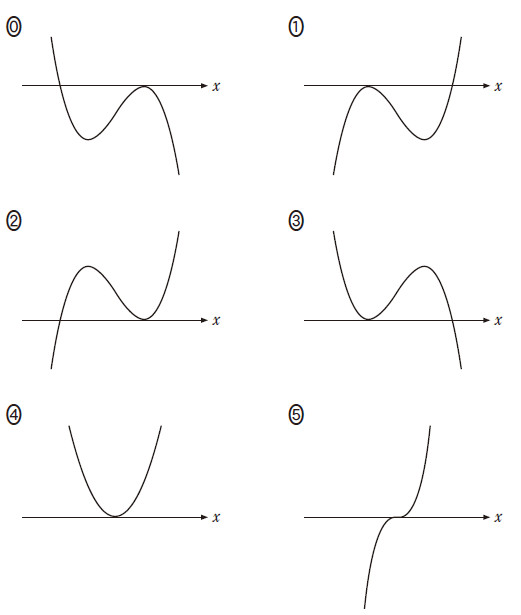 つまり、 $x=0$ のところで谷のようになっていて、 $x=k$ のところで山のようになっています。これを満たすのは、選択肢の中では 0 か 3 です。 $F(x)$ の極小値が $0$ だと冒頭に書かれているので、極小値が $x$ 軸上にある 3 が $y=F(x)$ のグラフとなります。