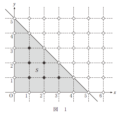 例えば、直線 $y = -x + 5$ と $x$ 軸、$y$ 軸で囲まれた図形を $S$ とする。$S$ は図1の灰色部分であり、$S$ の内部にある格子点を黒丸、内部にない格子点を白丸で表している。したがって、$S$ の内部にある格子点の個数は $6$ である。