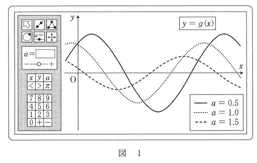 花子さんと太郎さんは、関数 $y=g(x)$ のグラフをコンピュータを用いて表示させてみた。図1は、$a=0.5, a=1.0, a=1.5$ としたときの $y=g(x)$ のグラフである。これを見て、花子さんと太郎さんは、関数 $g(x)$ について話している。